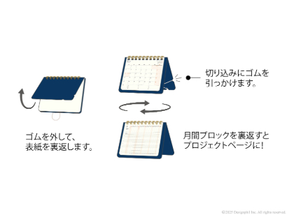 ページを開いて、ゴムバンドを表紙の切り込みに引っかけるだけで簡単に立てることができます。使わないときは、たたんで表紙をゴムバンドで留めることができるため携帯性にも優れています。ダイアリーの持ち運びが多い方にもおすすめです。