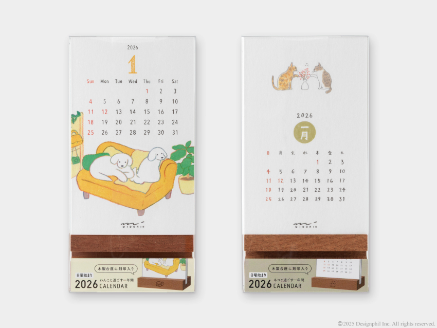 デザインは、『ポケットダイアリー』でも人気の「イヌ柄」と「ネコ柄」の2種類。いずれもイラストが大きく入っているため、それぞれの作家のイラストレーションを存分にお楽しみいただけます。木製台座には、イヌ柄とネコ柄それぞれに毎年異なるデザインの刻印が入っています。大切な方へのギフトにもおすすめです。