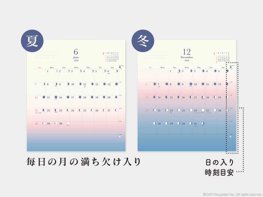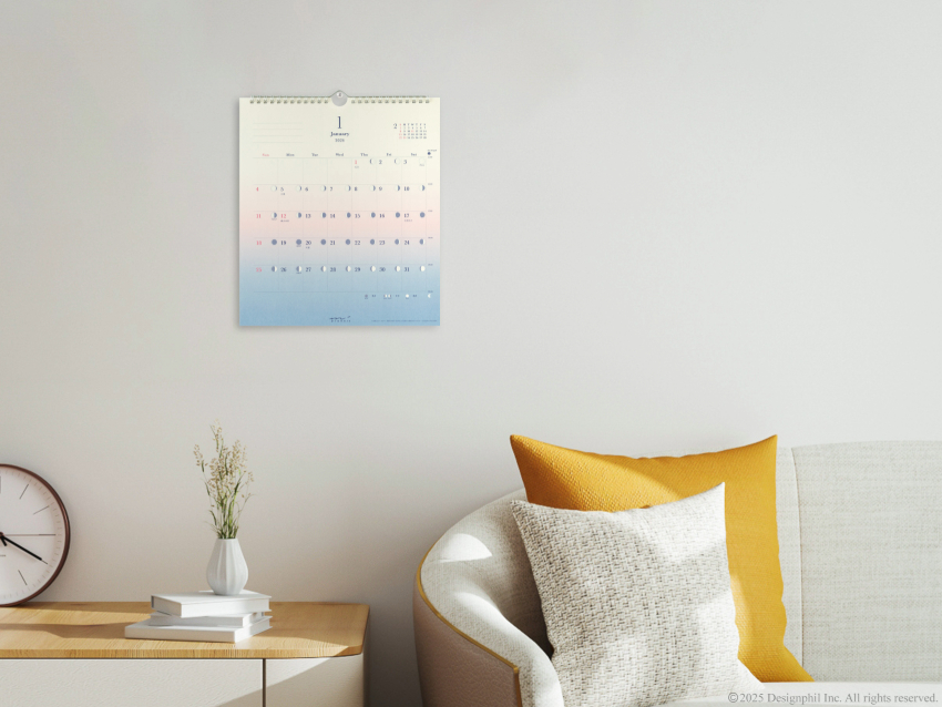 クリーム色の紙を使用することで柔らかな風合いに仕上げており、淡いカラーのグラデーションがインテリアになじみます。また、日付や月の満ち欠けのデザインは、見やすさにこだわりながらも主張しすぎないバランスでレイアウトしました。ふとした時に見ると、季節の変化を感じながら心のゆとりを感じられるカレンダーです。