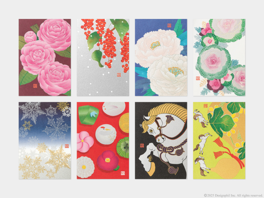 風合いのある「越前和紙」に、シルク印刷で、選りすぐりの冬モチーフを大胆に映しました。