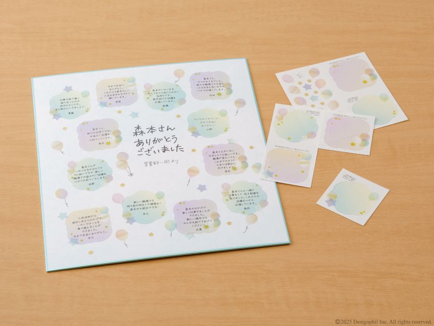 色紙の内側に印刷されたガイドに合わせてメッセージシールを貼るだけで、簡単に寄せ書きが完成。配置のバランスが良く、統一感のあるカラーできれいな仕上がりになります。