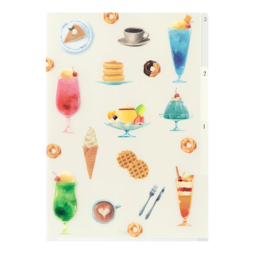喫茶店の定番スイーツやカラフルな飲み物をデザインしました。透明感のあるイラストがポイントです。