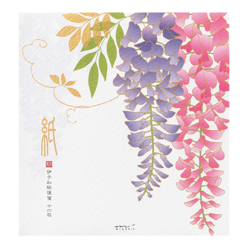 花びら部分に細く繊細に輝く金色のシルク印刷を施し、風に揺れる満開の藤の花を表現しました。特有のハケ目がある風合いのある伊予和紙を使用しています。