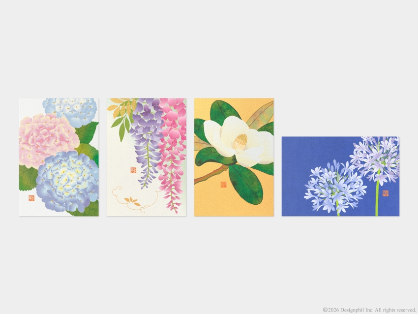 クレマチス、紫陽花、ルピナス、しゃくやく、と初夏に咲く爽やかな青系の花を基本とした、4種類の花をアソートしました。やさしい肌合いの越前和紙「越前鳥の子」を使用しています。
