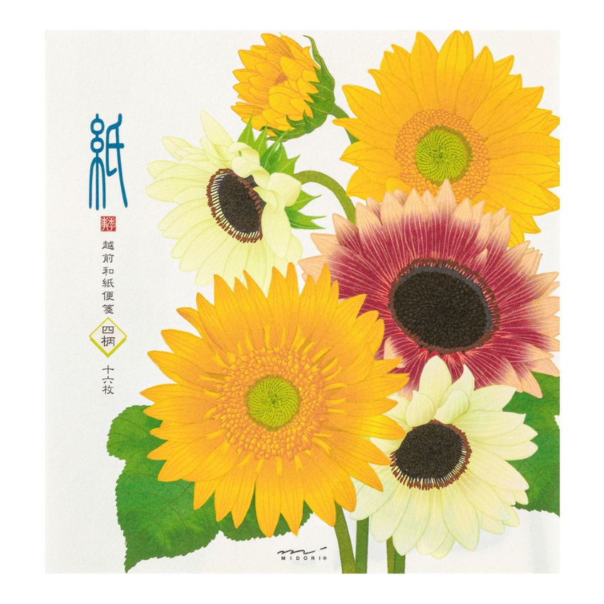 夏の日差しの中あざやかに咲く、大きさや色など品種の異なる4種類のひまわりをアソートしました。やさしい肌合いの越前和紙「越前鳥の子」を使用しています。